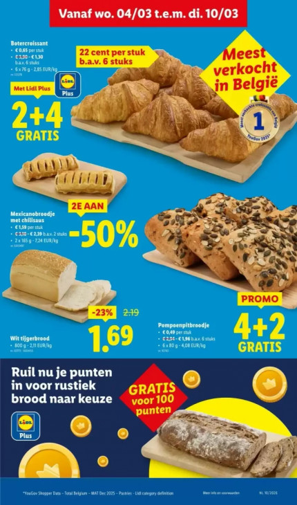 Deze tekst wordt automatisch gegenereerd, dus deze kan fouten bevatten.Vanaf wo. 04/03 t.e.m. di. 10/03 ek 22 cent per stuk a Meest b.a.v. 6 stuks ab: ke verkocht .. Met Lidl Plus ın Belgie ed ik 1 [N 2 {hub thin 2 2E AAN 4 + rs we B > 2 N D & En 8 Pr OM 23% =, .… =. — Ruil nu je punten in voor rustiek GRATIS ® brood naar keuze voor 100 Egan Le. ne GH ®@ R punten é = k Meer info en voorwaarden NL 10/2026 "YouGov Shopper Data - Total Belgium - MAT Dec 2025 - Pastries - Lidl category definition