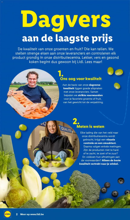 Deze tekst wordt automatisch gegenereerd, dus deze kan fouten bevatten.Dagvers aan de laagste prijs De kwaliteit van onze groenten en fruit? Die kan tellen. We stellen strenge eisen aan onze leveranciers en controleren elk product grondig in onze distributiecentra. Lekker, vers en gezond koken begint dus gewoon bij Lidl. Lees maar! + 1. Ons oog voor kwaliteit RD 4 Aan de basis van onze dagverse In kwaliteit liggen goede afspraken © met onze leveranciers. Samen kh bepalen we strikte voorwaarden voor je favoriete groente of fruit, van het gewicht tot de verpakking LL. DEED Lu Elke lading die van het veld naar onze distributiecentra wordt gebracht, krijgt een visuele controle en een smaaktest. Daarna volgen enkele metingen. FR Zijn de producten niet te hard N of te zacht, te zoet of te zuur? A En voldoen hun afmetingen aan de voorwaarden? Alleen de beste no kwaliteit vertrekt naar je winkel. 2 Meerop www.lidl.be