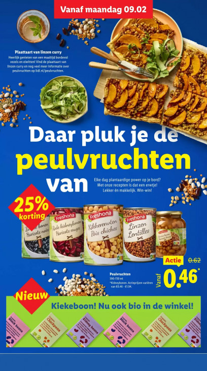 Deze tekst wordt automatisch gegenereerd, dus deze kan fouten bevatten.Vanaf ERUEER, Eee KT) dd ” L ded € at A “ € © 20 ra 4 A à e en Plaattaart van linzen curry ed N Di Heerlijk genieten van een maaltijd bordevol 2 vezels en eiwitten! Vind de plaattaart van a linzen curry en nog veel meer informatie over peulvruchten op lidl.nl/peulvruchten. u ER le ) > ntm © ke à fj ie ON nr dS A NE e M 7 Ca LE 7 À En Lo fi 7 JA BR - 2 0 2 3: 13 Enr a age ES #] > 4 7 H 3% D > un Û u |: 0 2. ER Daar pluk je peulvruchten. Elke dag plantaardige power op je bord? Met onze recepten is dat een erwtje! van Lekker én makkelijk. Win-win! © € A e «a ge 25% na zn ea korting, (GS none > UE y: ! Ineybst en vou NU fhere wier ric ris chien re vi a © nee À) LLC Ch Le 390-720 ml *Kidneybonen. Actieprijzen variören van €0.46 - €1.94. 46 :0 I 2 od Û Ieuw Kiekeboon! Nu ook bio in de winkel! Ge g ‘es nt, EN Le, %, © he N NC oO N as ® en 2 aA“ 9 & > Ad