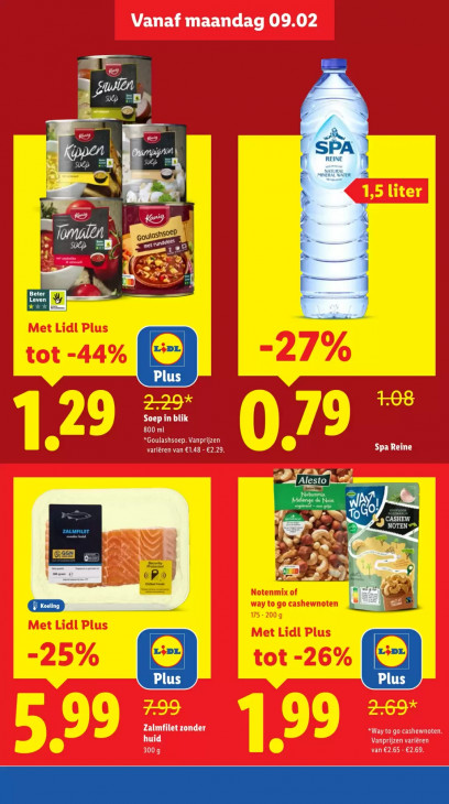 Deze tekst wordt automatisch gegenereerd, dus deze kan fouten bevatten.Vanaf maandag 09.02 an 8 HL on CA hed 7 ” | an 1 ue ET. ELU *Goulashsoep. Vanprijzen variëren van €1.48 - €2.29. Spa Reine > Ay ee | BE 4 (LC "m den = \ iR H 3 es we 2 © Pe | u ä Zalmfilet zonder *Way to go cashewnoten. une Vanprijzen variëren van €2.65 - €2.69. 3009